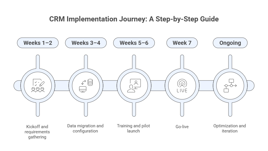 CRM implementation journey visual timeline: kickoff, data migration, training, go-live, and continuous optimization phases for successful CRM deployment