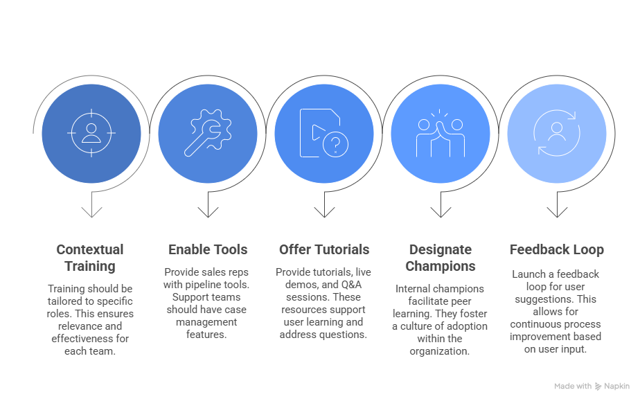 CRM user adoption strategies: contextual training, enabling tools, offering tutorials,