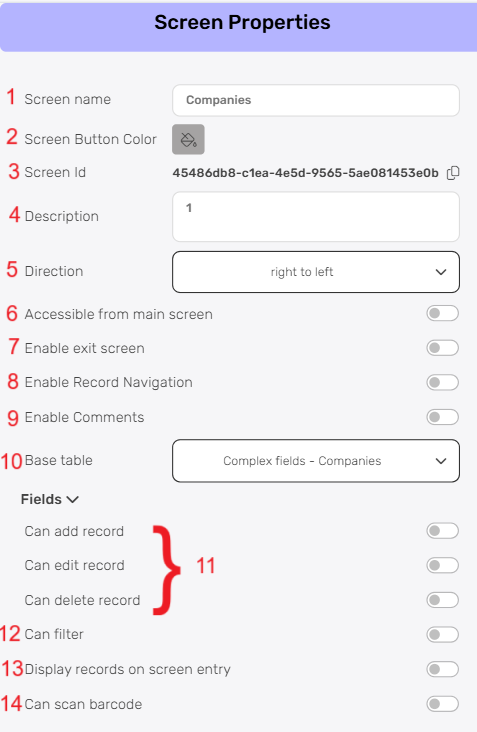 The “Accessible from Main Screen” option allows direct access to this screen from the main application screen. When enabled, the screen is accessible from the main application screen. - Enable exit screen