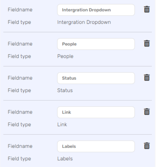 - Field type – Fixed for each type, including Integration Dropdown, People, Status, Link and Labels fields.