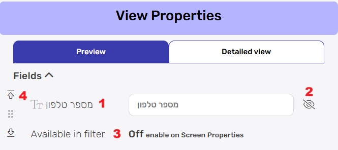 Adjacent to the Field name is an eye icon – clicking it toggles visibility of the field. This empowers you to decide whether users see the field or if it remains hidden. A crossed-out eye indicates the field is hidden from users. - Available in Filter