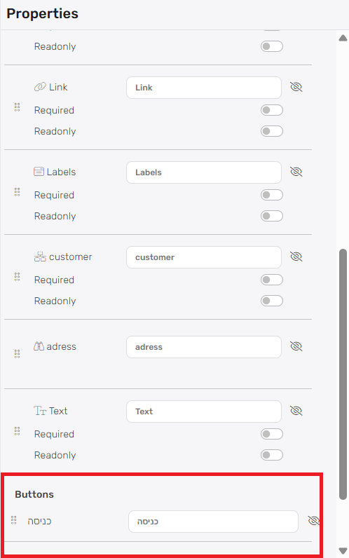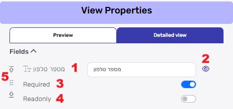 Adjacent to the Field name is an eye icon – clicking it toggles visibility of the field. This empowers you to decide whether users see the field or if it remains hidden. A crossed-out eye indicates the field is hidden from users. - Required