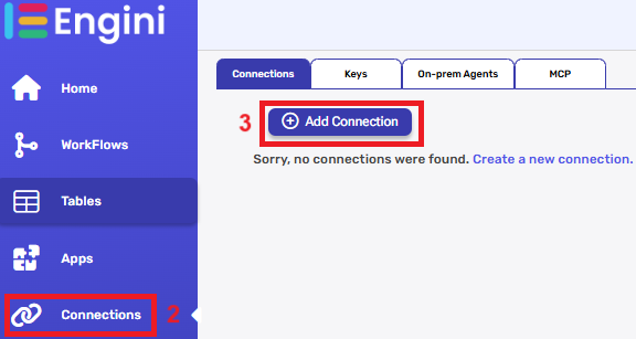 - Navigate to connections page by clicking on the Connections on the left sidebar or by clicking here.