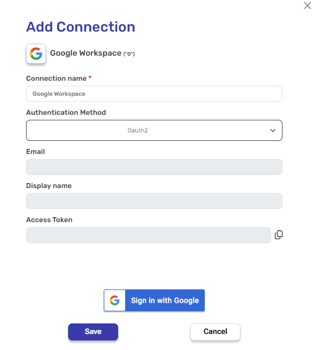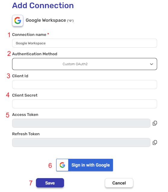 - Access Token & Refresh Token – Automatically populated post connecting to a your Google account.