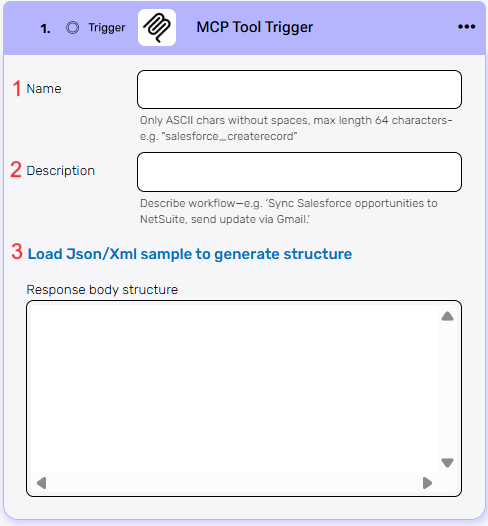 - Load Json/Xml sample to generate structure – Click to upload a sample JSON or XML response from the MCP tool.