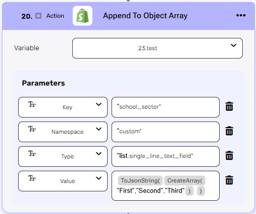 Use the Append action to add Metafields one by one. Each Metafield object must include:namespacekeytypevalue
