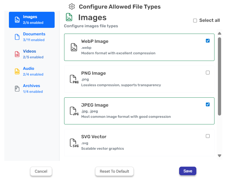 - Images: jpg, jpeg, png, webp, gif, svg, bmp.