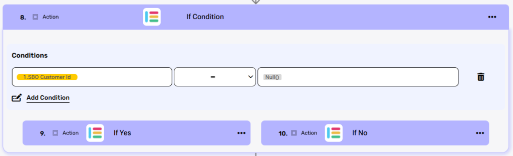 Add the “If Condition” action of Engini to check whether the customer has been established in SBO or not. When we create a customer in SBO, we will populate the “SBO customer id” field with the number of the created customer.