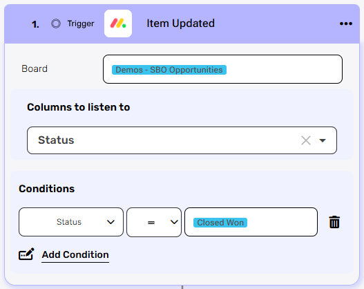 Add the “Item Updated” action in monday.com so that the flow will be triggered when the item’s status changes to “Closed Won.”