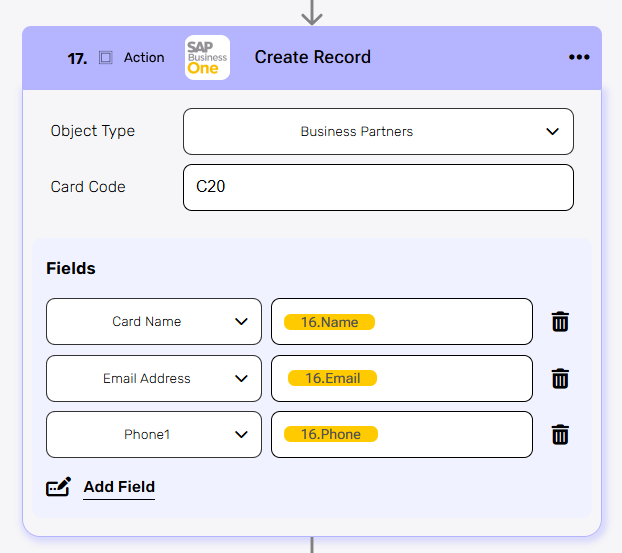 - Add the “Create Record” Activity of SBO and create the card of the “Business Partner”.