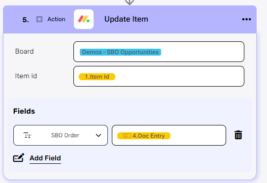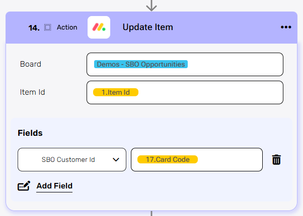 - Add the “Update Item” activity in monday.com to update the item with the business partner ID (“Card Code”) that was created.