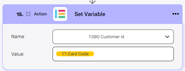 If the condition isn’t met, add “Set Variable” activity to update the variable you initialized with the “Card Code” obtained in the trigger.