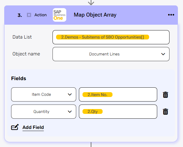 Select “Document Lines” from the “Map Object Araay” activity, to link the associated document lines. - Doc Date