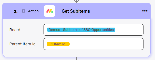 Select from the drop-down menu the “Demos – Subitems of SBO Opportunities” board option. - Parent Item Id