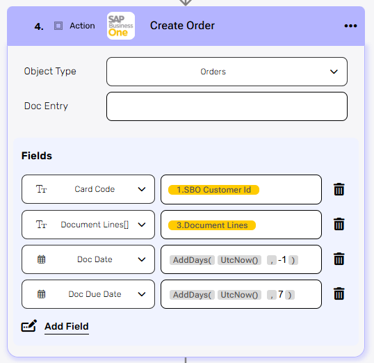 Choose the functionsAddDaysandUtcNowto crate the manipulation ofAddDays(UtcNow(), -1)to set the document date to one day prior to the current date. - Doc Due Date